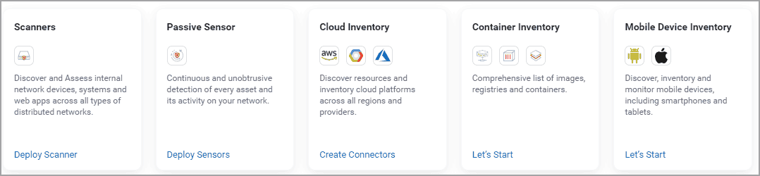 You can build your inventory for on-prem (devices and applications), mobile, endpoints, clouds, containers, OT and IoT assets using scanners, sensors, or connectors.