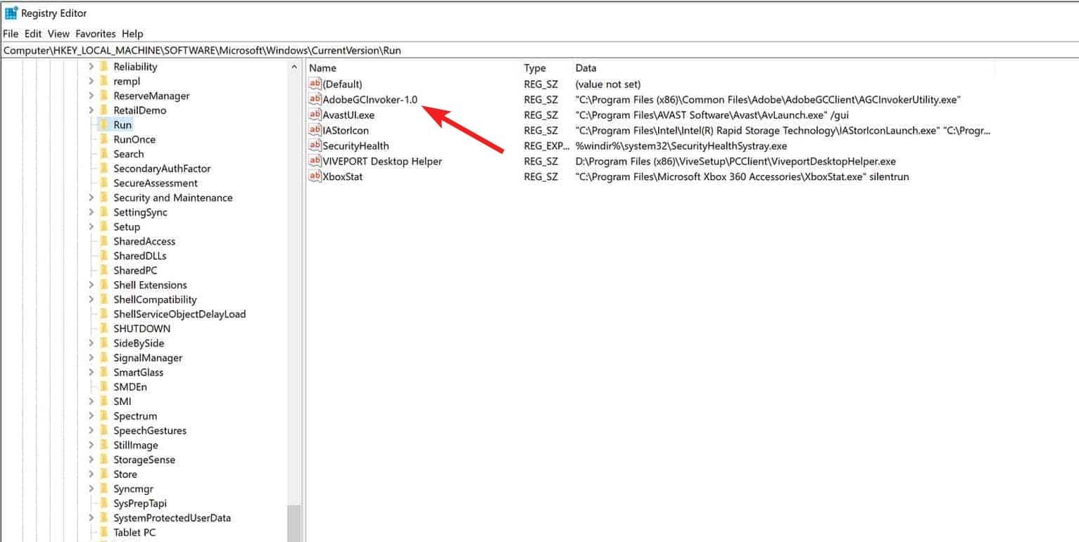 Computer / HKEY_LOCAL_MACHINE / SOFTWARE / Microsoft / Windows / CurrentVersion / run - Look for the AdobeGCInvoker-1.0 key in the given location.