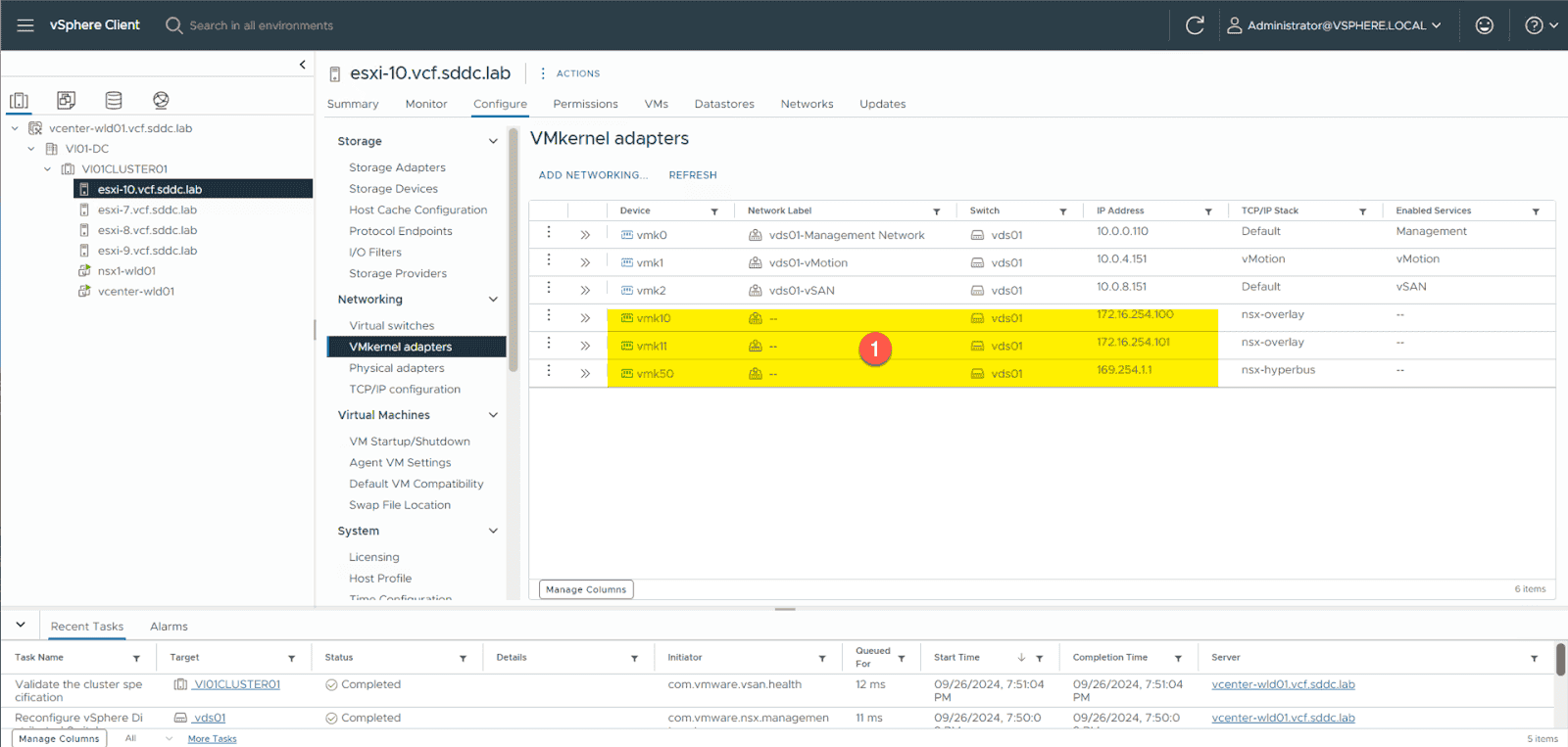 - Verify you see adapters: vmk10, vmk11, and vmk50