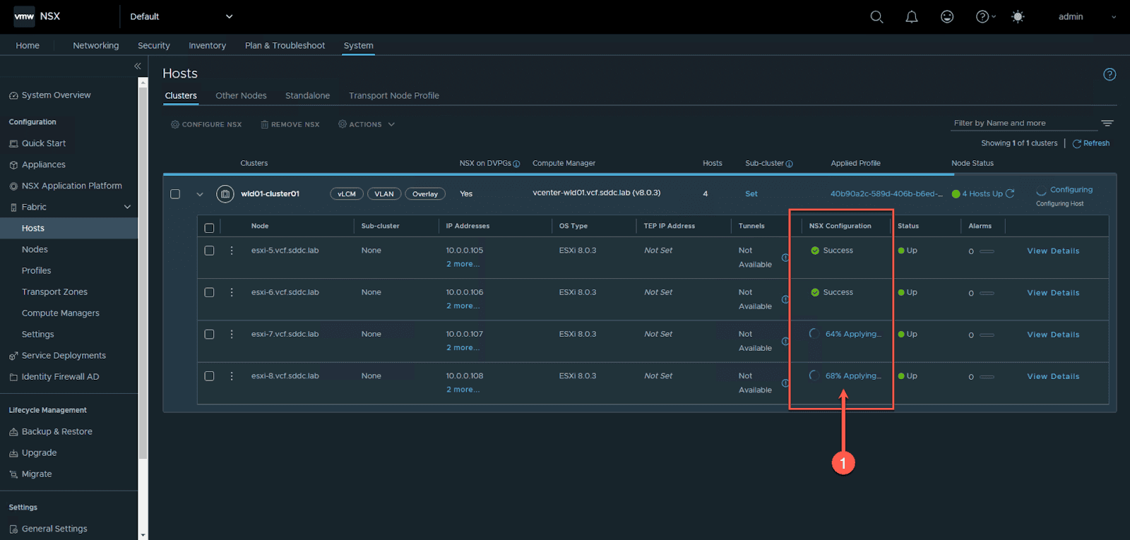 Wait for the host TEP configuration to complete and the status for all hosts to return to “Success”. This can take a few minutes to complete.