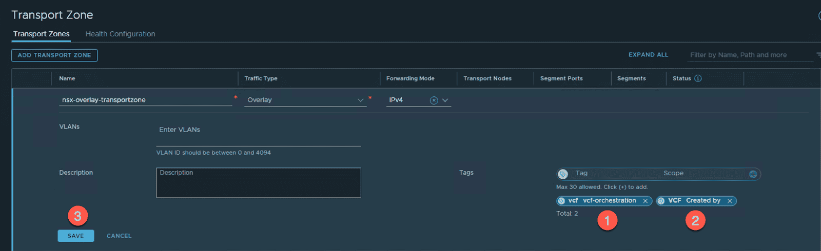 Start by adding two tags to the TZ. These tags are used internally by the SDDC Manager to identify the TZ as being used by VCF. Note that there are two parts to the tag, the tag name and the tag scope. Also, tags are case sensitive so you will need to enter them exactly as shown.