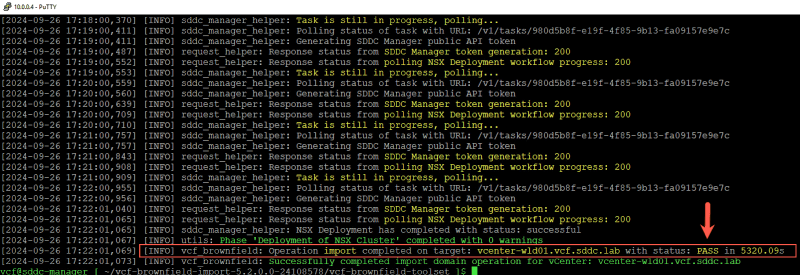 begin by ensure that the vCenter Server instance was successfully import and NSX properly deploy . The screenshot is shows below show the output of the VCF Import CLI tool . note the status of “ pass ” for the vCenter instance namevcenter-wld01.vcf.sddc.lab.