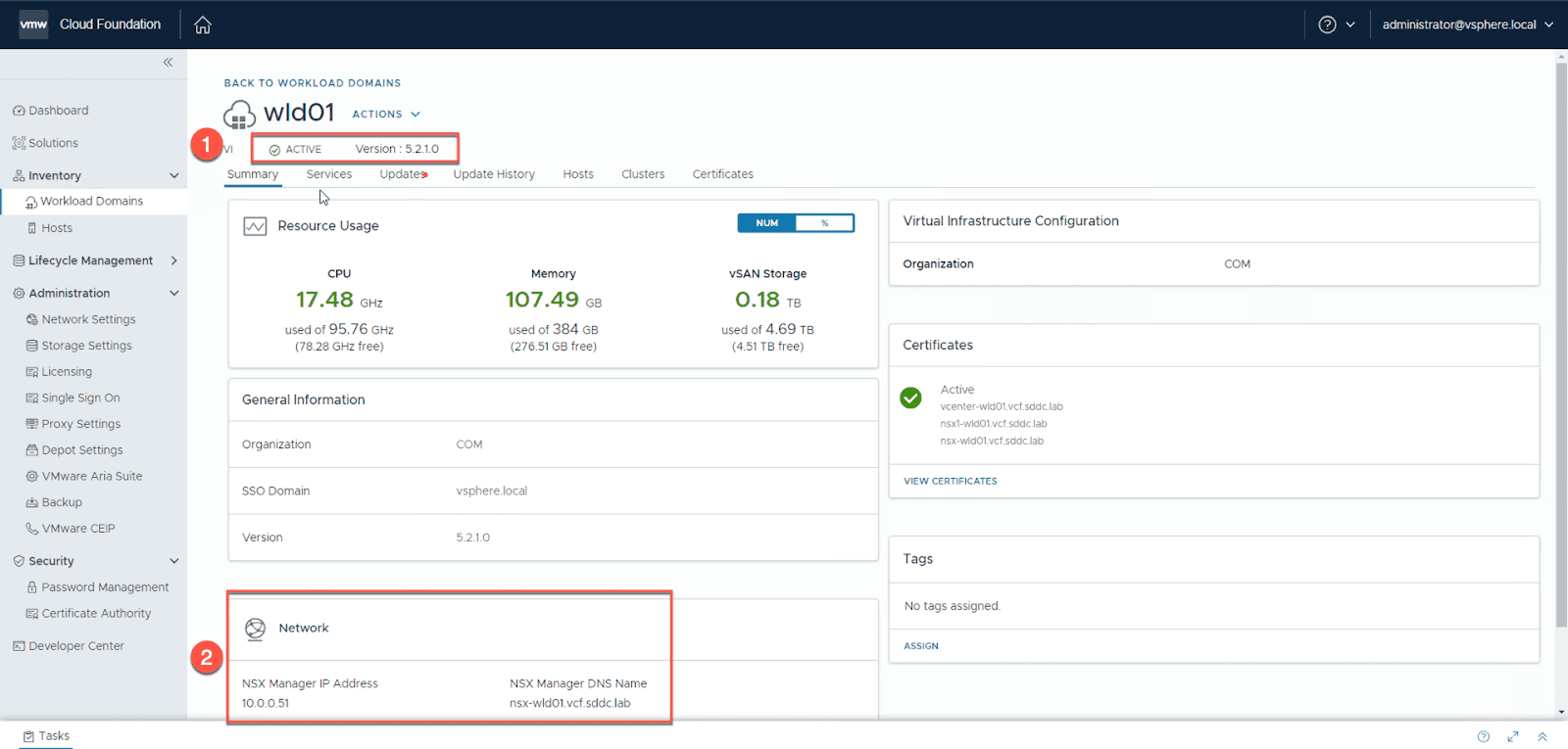 - confirm the workload domain status show active and has an NSX Manager IP address assign .