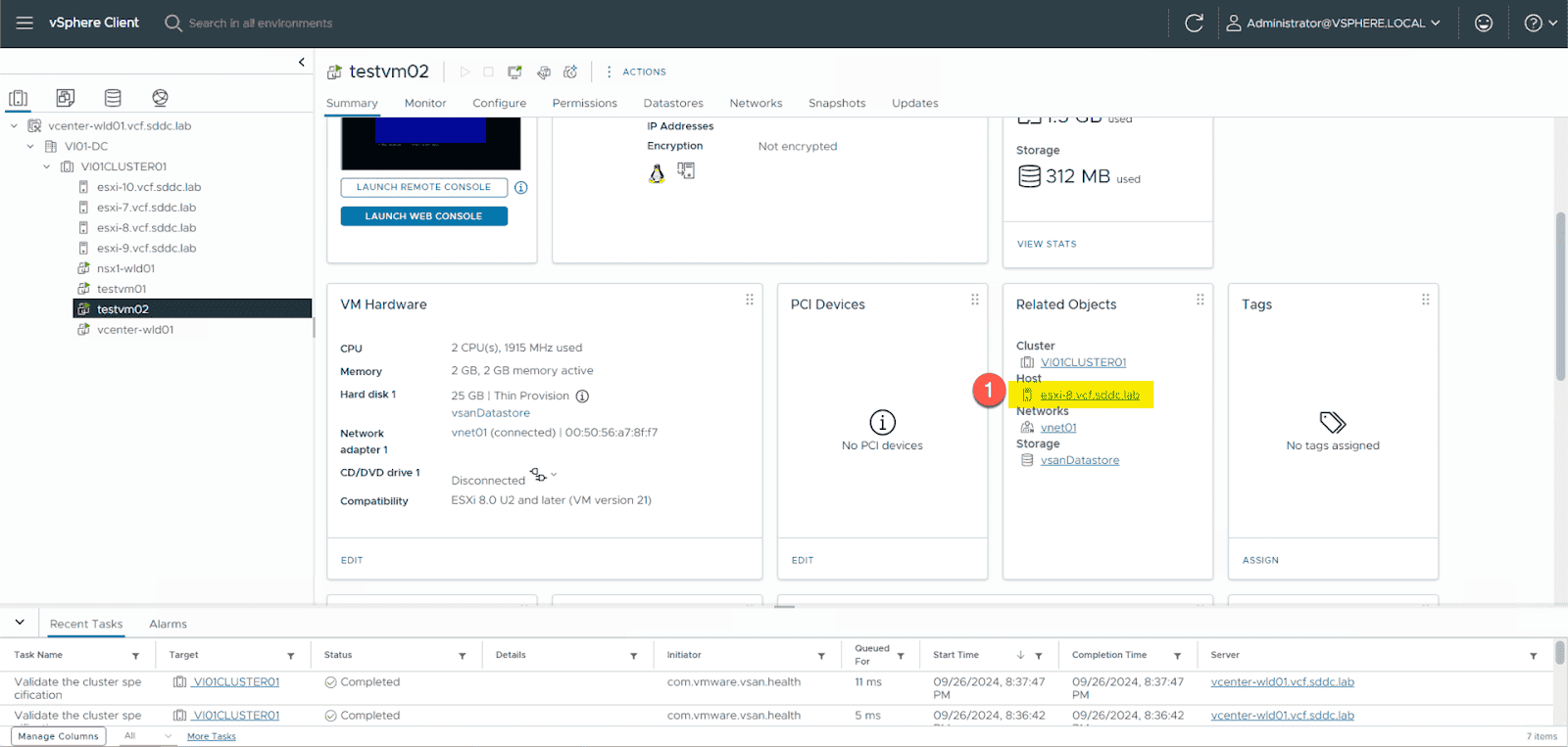 create a clone of the ‘testvm01’ VM named ‘testvm02’. Verify ‘testvm02’ is also attached to the virtual network ‘vnet01’. Power both VMs on and make sure they are running on separate hosts. Use vMotion to migrate one of them if necessary.