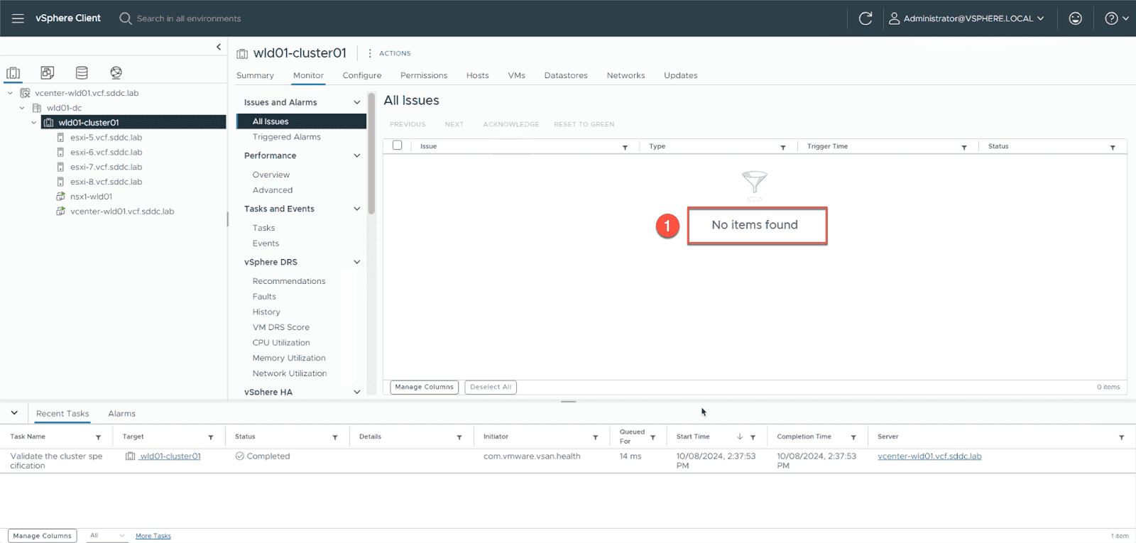 - navigate tothe vSphere Cluster -> Monitor -> All Issues