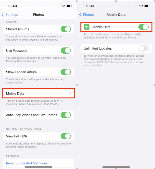 Another reason could be that iCloud Photos has been restricted to update over Wi-Fi only. To check or allow it to update using your cellular data: