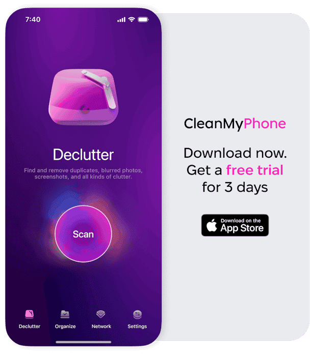 You can improve the speed of access to iCloud Photos. How? Simple. You need to have a more organized library and a less cluttered space. With CleanMy®Phone, you can quickly clean up some space on your device. It scans your iPhone and divides the clutter into categories, including duplicate photos, screenshots, and screen recordings, so you can quickly decide what you want to keep and what you want to get rid of.