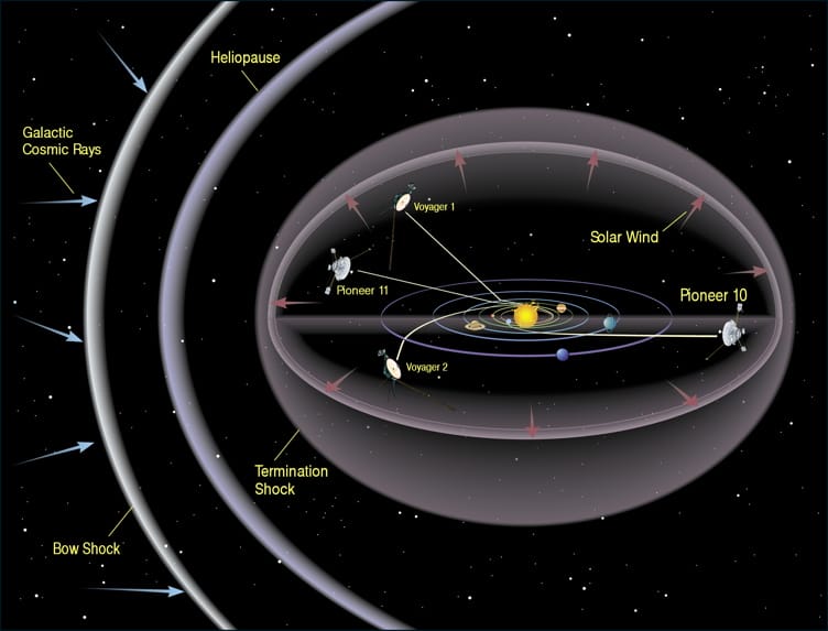 Two of the space probes sent out from Earth, Voyager 1 and Voyager 2, have now passed through the Heliosphere boundary. Voyager 1 exited in 2012, and Voyager 2 in 2018 [A7]. One Voyager scientists commented “There’s a distinct boundary out there. It’s just astonishing how fluids, including plasmas, form boundaries.”