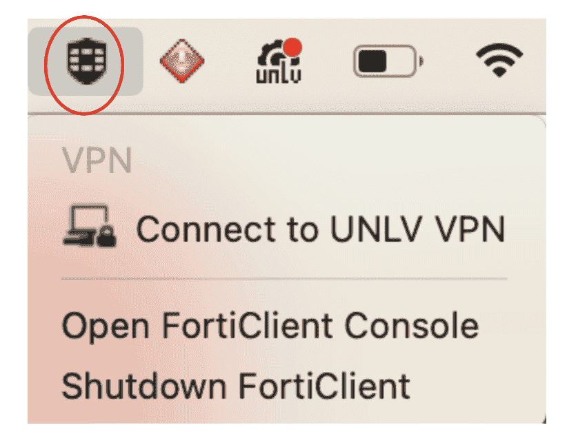 7. When the installation is complete, Please verify that UNLV VPN is an option to connect from the Fortinet icon in the menu bar