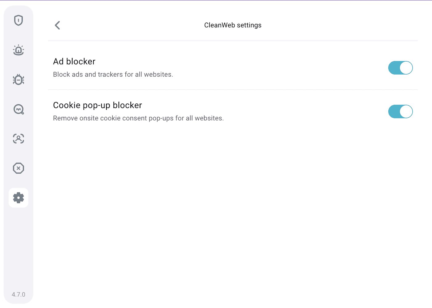 At CleanWeb setting , you is toggle can toggle ad and Cookie pop – up blocker .