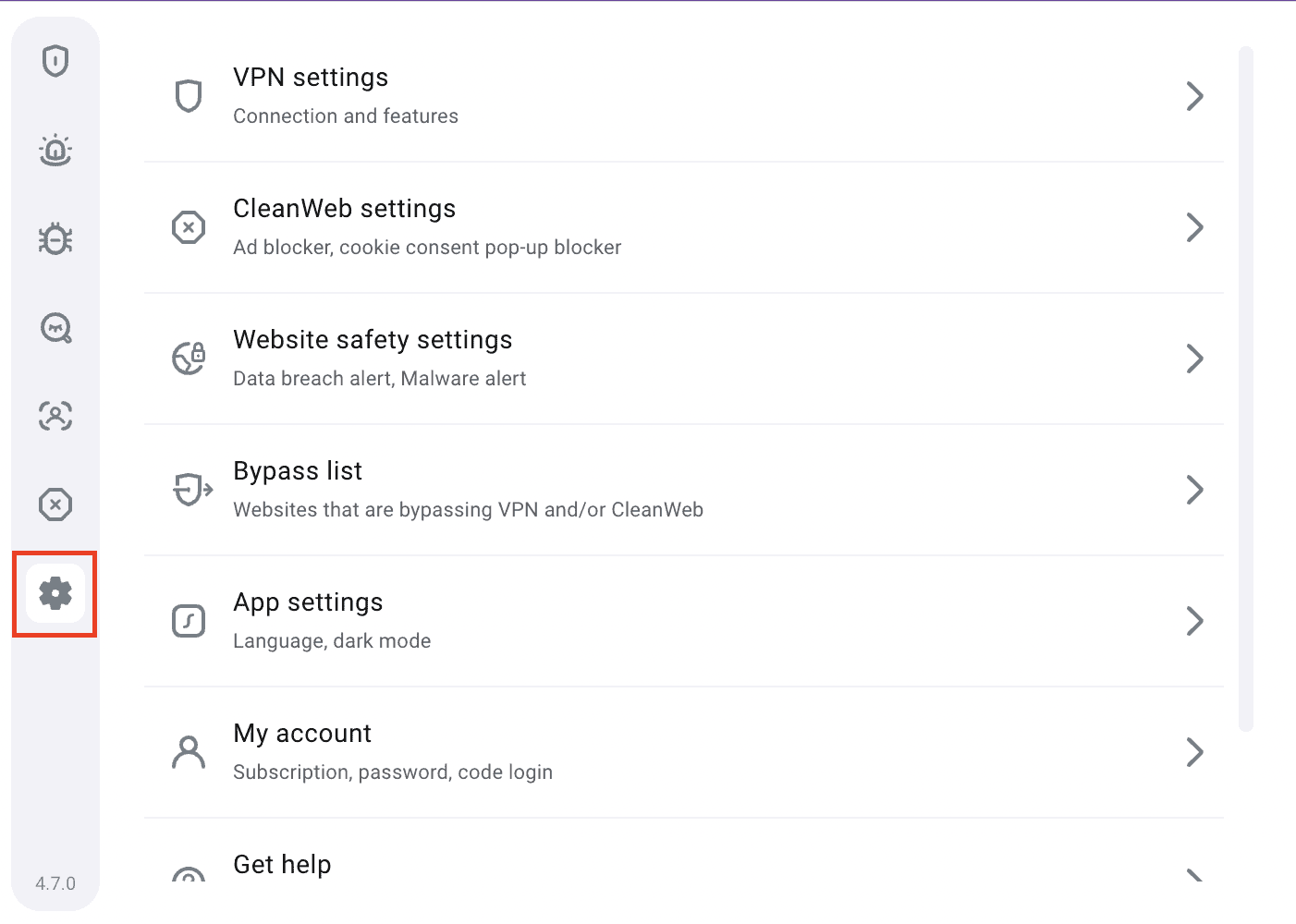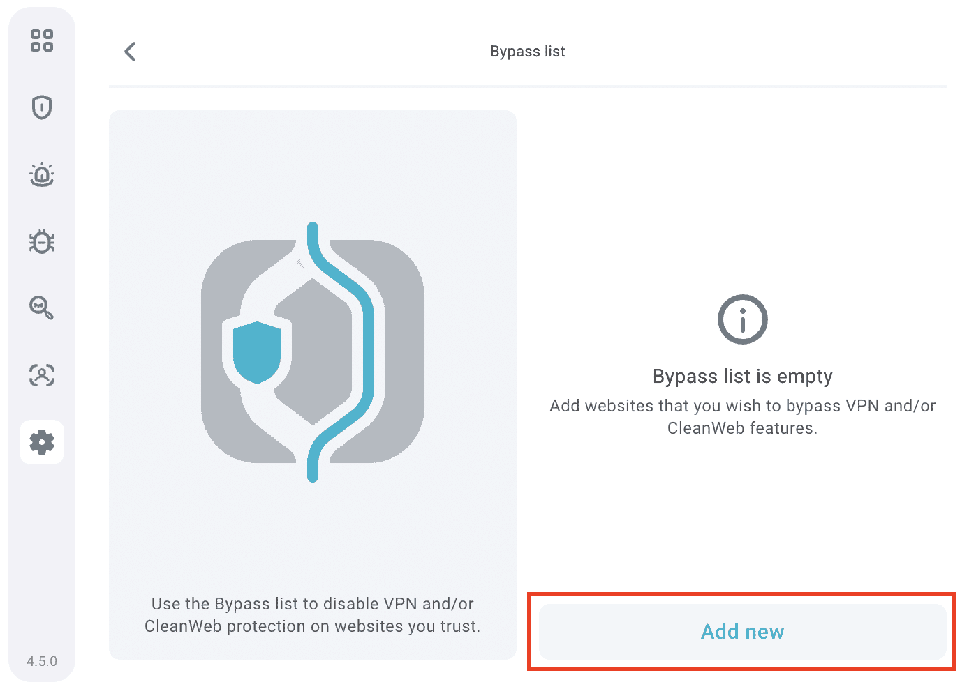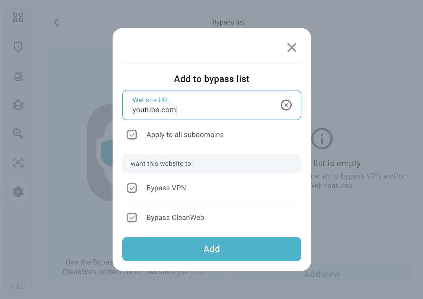In the Bypass list tab, you can configure which websites bypass the VPN connection. You can also configure which websites are affected by CleanWeb.
