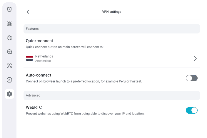- toggle the webrtc feature , which prevent website from using WebRTC to discover your ip and location