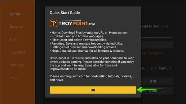 When the downloader open , you will be present with a quick Start guide . Give it a read , and then click the ok button to start using downloader on your Amazon device .