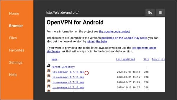 Select the apk file that you want to install . I is installed instal the ics-openvpn-0.7.16.apk ,