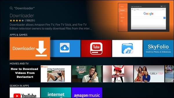 Type in downloader. As you type it in, search results will appear below. When you see Downloader, scroll down.