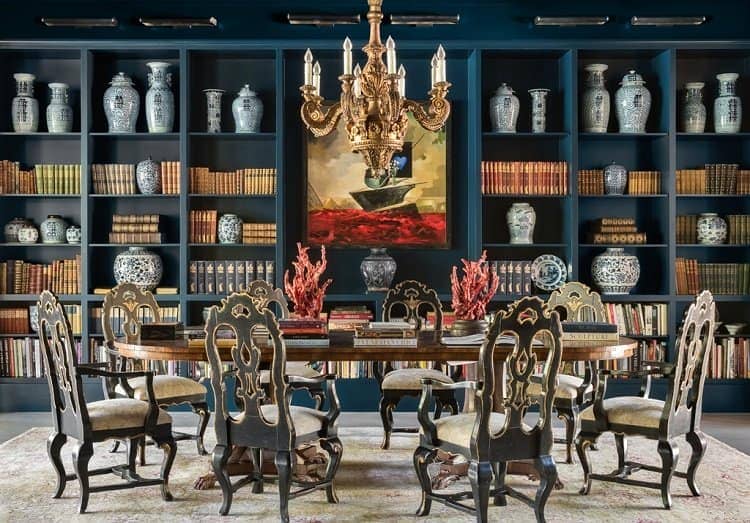 The living area is accented by dark blue walls and dramatic furnishings. Image credit: Peter Vitale via Benjamin Wood