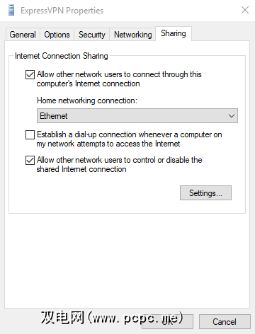 右键单击它,然后选择属性强>。在共享标签上,启用 Internet连接共享,然后在下拉菜单中选择以太网连接。