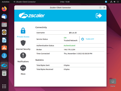 Once connect you is see will see the Zscaler icon in the system tray will turn blue and under the “ Private Access ” ( padlock icon ) section within the client you will see the Service Status indicate “ ON ” .