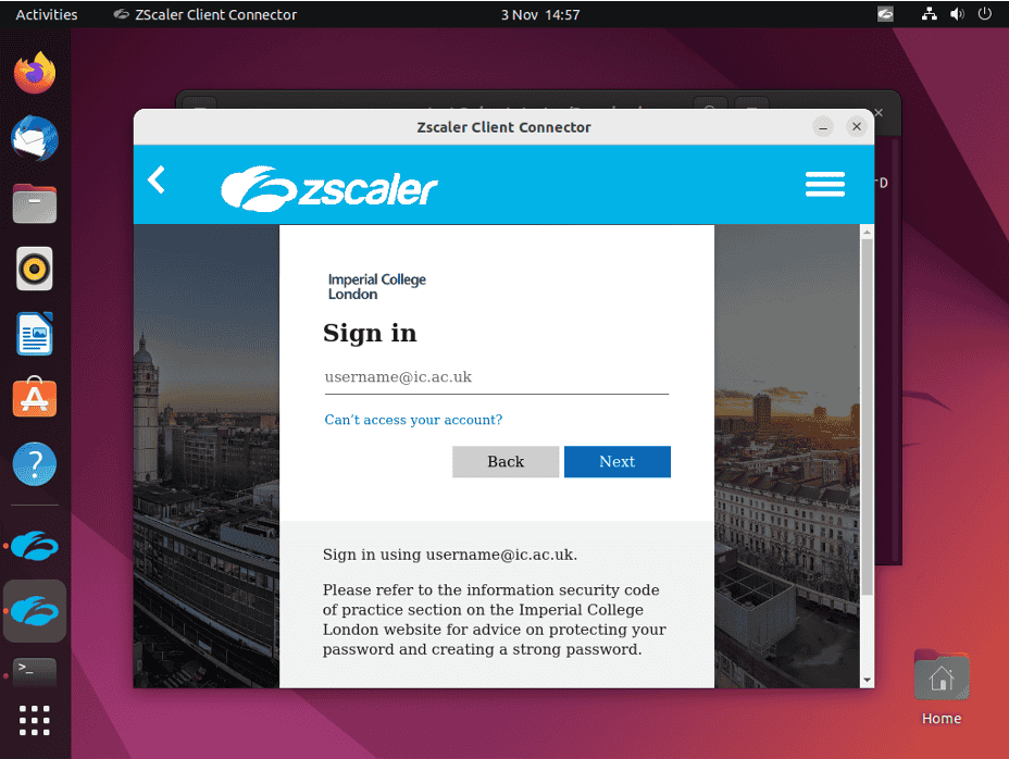 Once installation is complete the Zscaler client should open automatically and prompt you to log in. Enter your username@ic.ac.uk as you would to connect to Office 365. You will be required to enter your password and may need to respond to a multi-factor authentication (MFA) request too.