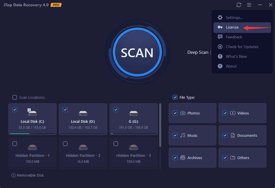 1. Open iTop Data Recovery Pro, click the option icon at top right of the main screen , and selectlicense in the menu .