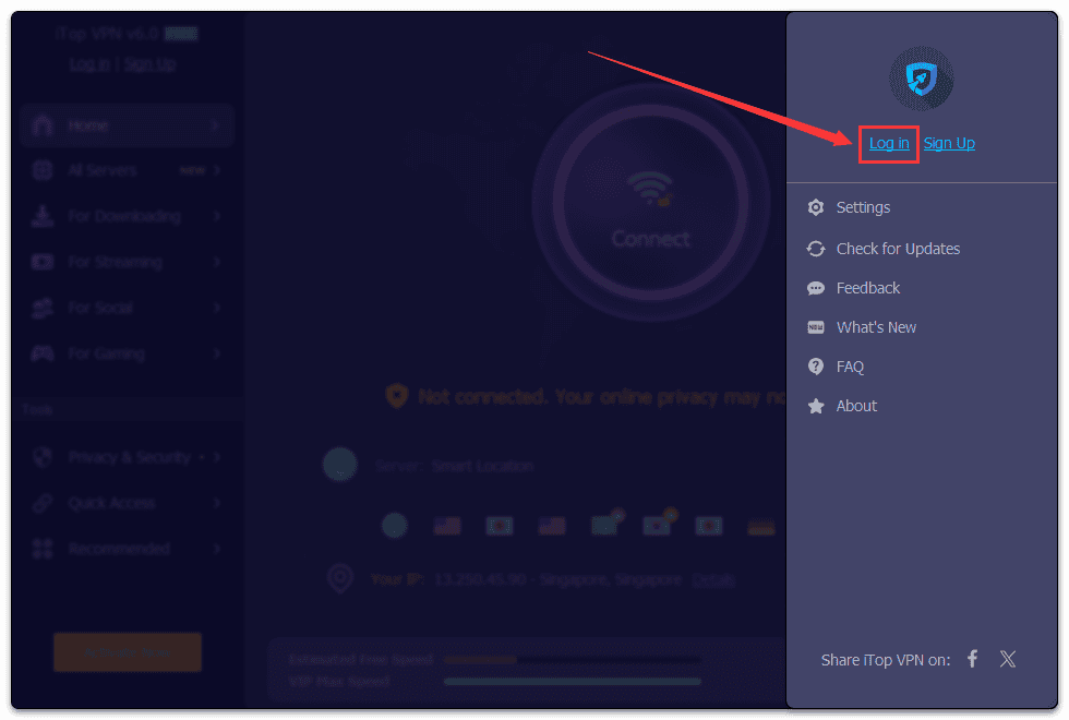 2 . Open iTop VPN is click , click the top leave Log in icon . Or click the top right option icon, then click Log in to open the Log in window.