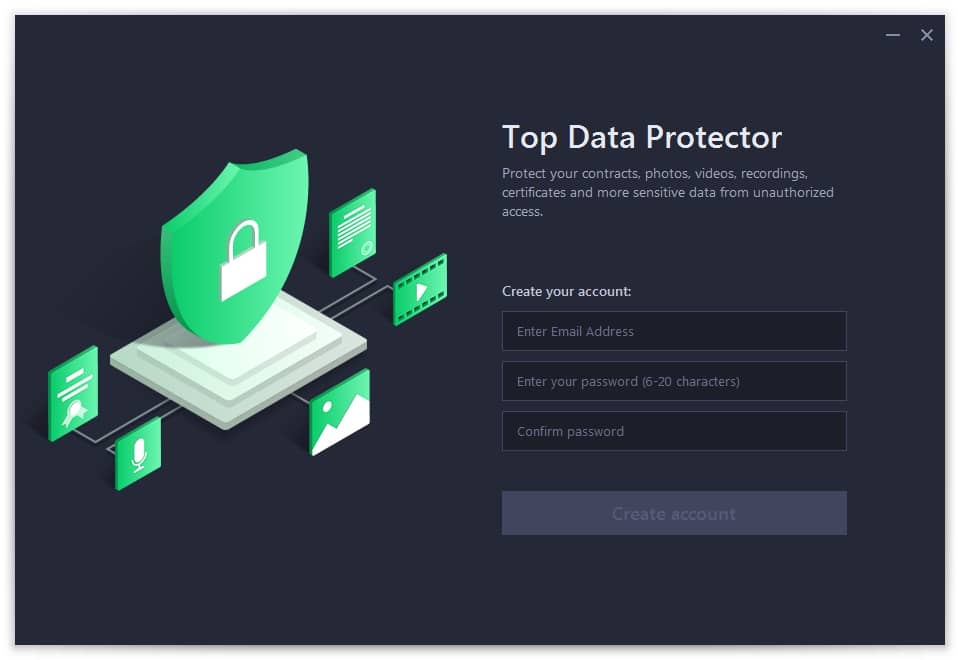 If this is the first time you open Top Data Protector, please refer to pictures below to create your Top Data Protector account first: enter your email address, set a password, and then click the Create account button .