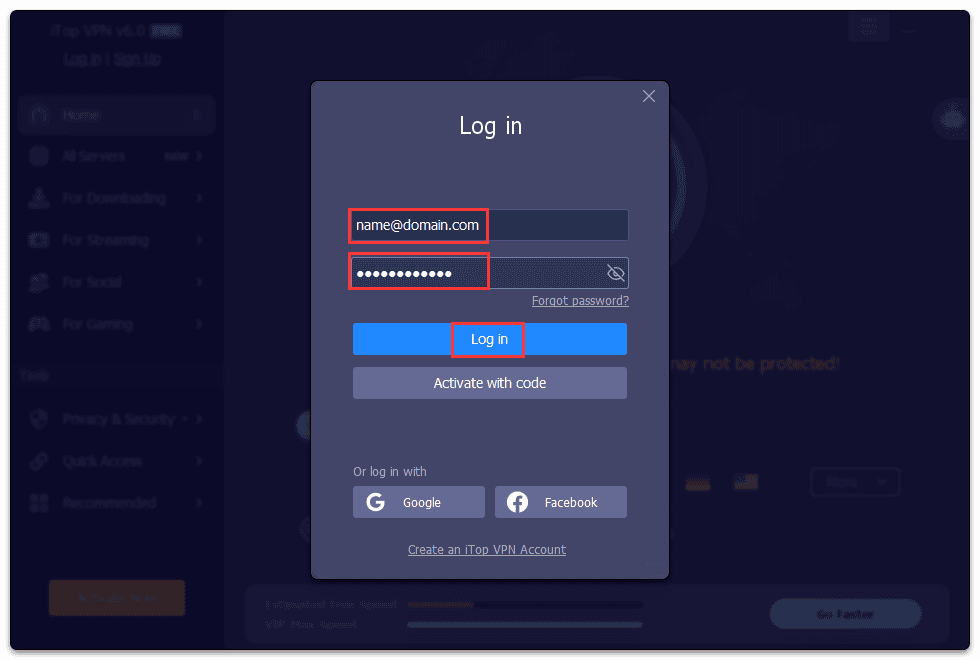 3. Enter your iTop VPN account and password, click the Log in button .
