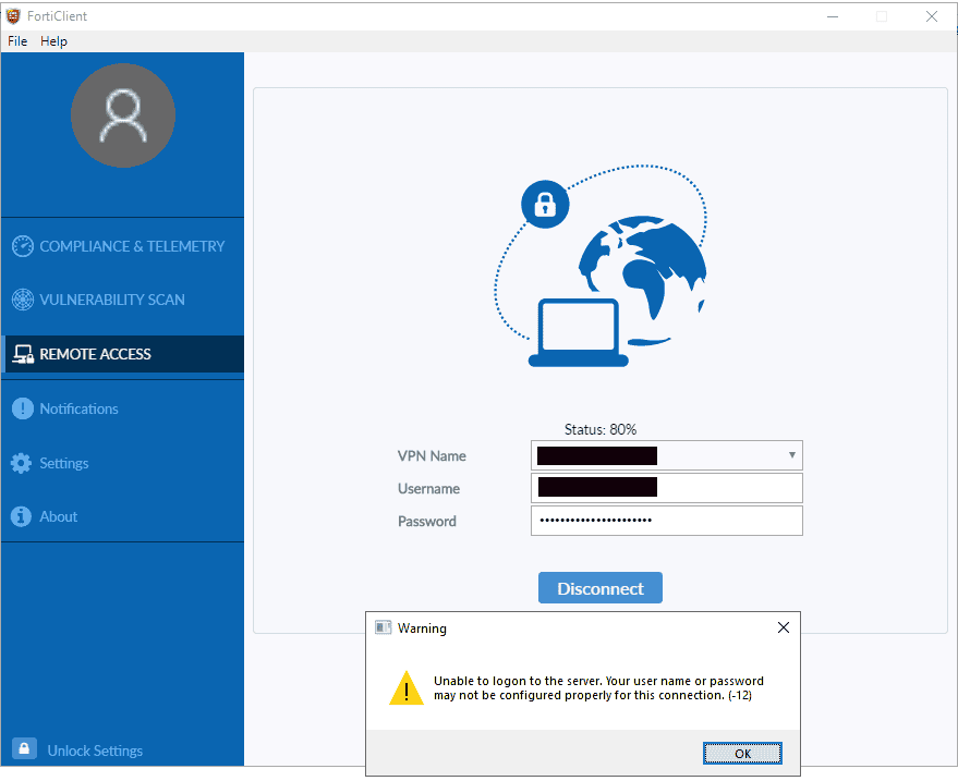 Il possibile motivo dell’errore “Connessione FortiClient non riuscita (errore=-12)” può essere il nome utente o la password che non corrispondono a quelli del dispositivo o del dispositivo. Questo errore può essere visualizzato anche se non ti trovi nel gruppo utenti corretto che dispone dell’accesso VPN (il gruppo firewall locale o il gruppo di server “LDAP” se ne stai utilizzando uno).