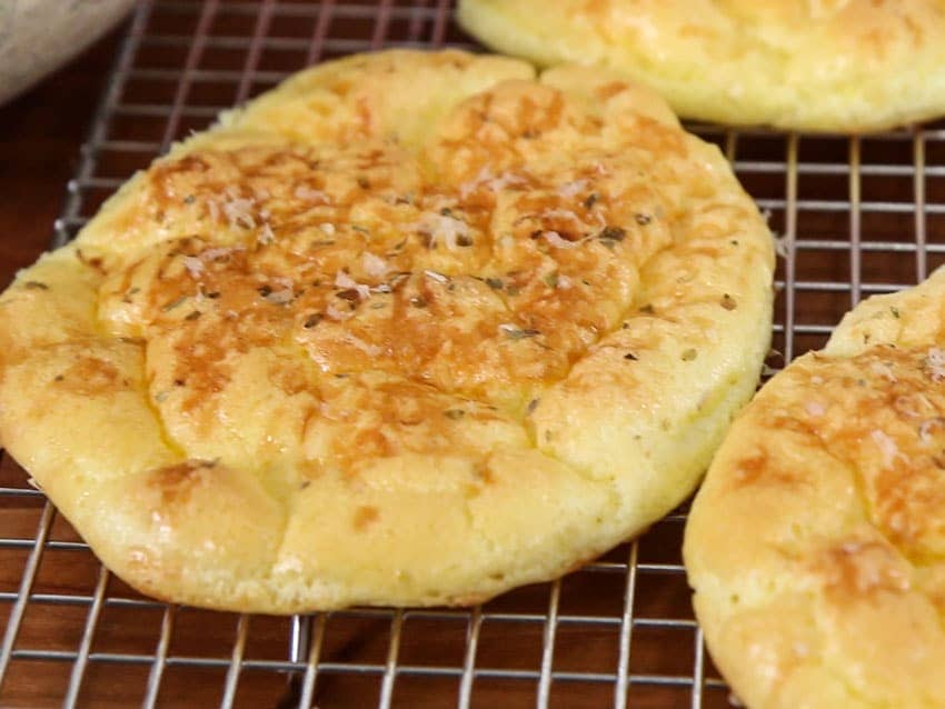 I like to add a bit of dried oregano and grated Pecorino cheese to the tops of the cloud bread before baking them in the oven. This gives the cloud bread recipe a bit of a Italian focaccia flavor. The baking time is about 30 minutes, but bake them until the cloud bread is very nice and golden brown. I like to move the keto cloud bread to a cooling rack so moisture does not accumulate on the bottom.