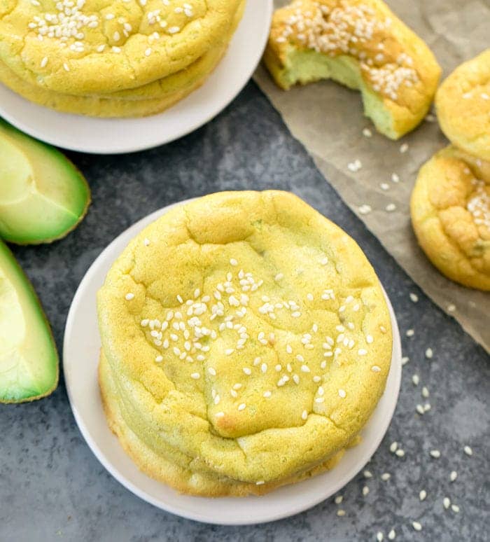 Avocado flavored cloud breads! These low carb,gluten-free,keto-friendly breads are made almost entirely of egg and avocado but they have a texture like regular bread.