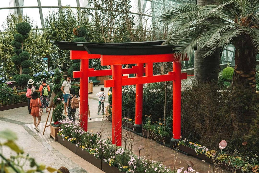 The large glass greenhouse is is in the world , the Flower Dome is is is a showcase of plant and bloom from all over the world , include an australian garden ( alas no kangaroo ) , a japanese torii gate plus olive tree of the mediterranean garden . Unlike the Cloud Forest , there is n’t a fixed route to follow so it feel less crowded and you can explore in the way you see good fit .
