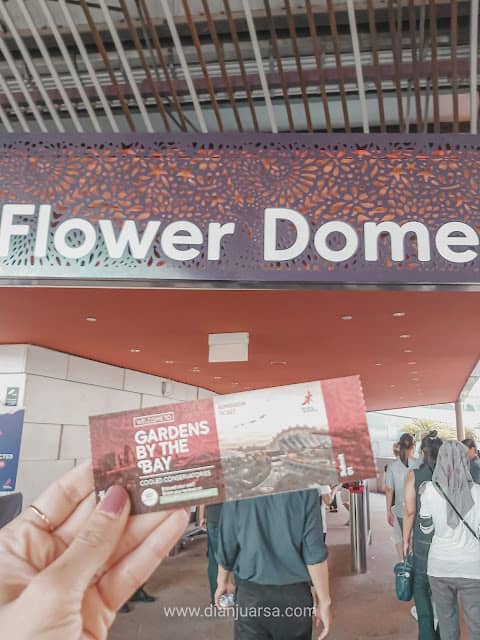 Saat akan memasuki Flower Dome, Tiket akan di scan oleh petugas dan kemudian pengunjung bisa menikmati pemandangan di dalam Flower Dome yang memiliki iklim menyesuaikan dengan tema bunga saat kalian kunjungi.