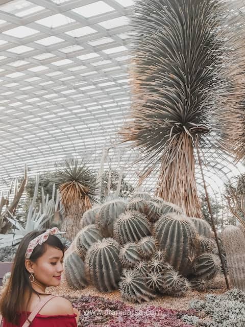 Flower Dome ini memiliki ratusan ribu jenis bunga. kalian bisa memilih ke jalur kanan yang dimana kalian akan melihat berbagai jenis tumbuhan kaktus dengan pemandangan marina bay sands dari kejauhan.