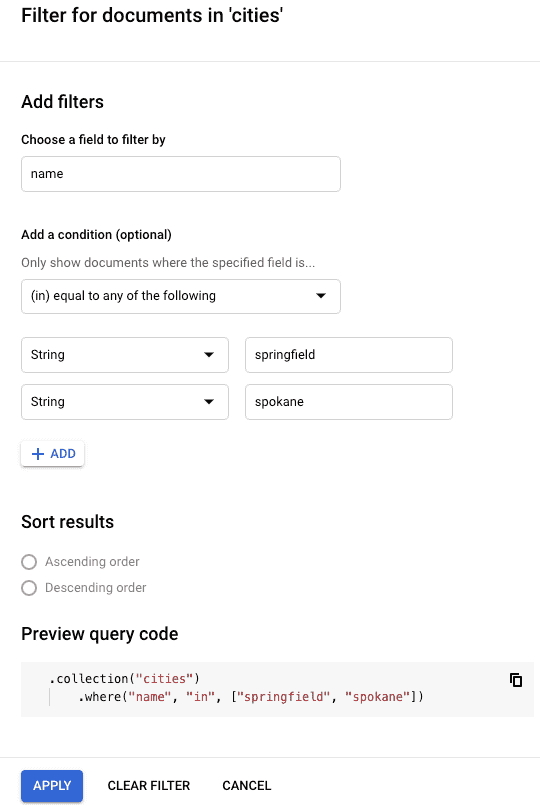 您可以根据字段值和 ==、!-、>、>=、<、<=、in、not-in、array-contains、array-contains-any 条件过滤集合中的文档。例如,您可以仅显示