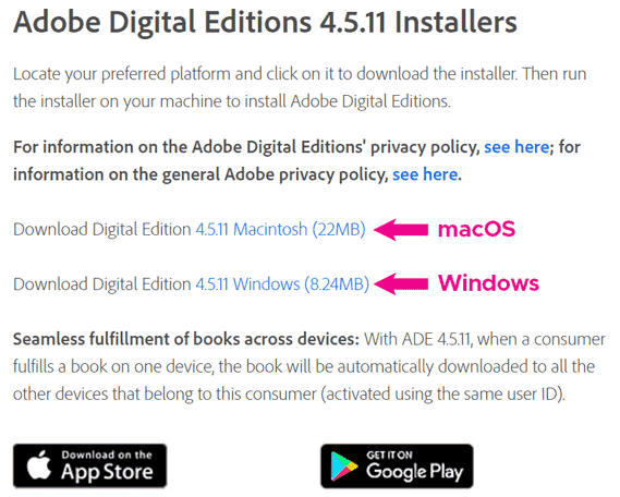 That will take you to the Adobe Digital Editions installers page. Click the appropriate link for your computer to download the app. Once downloaded, open the file to begin installation. You can also get Adobe Digital Editions for your mobile device.