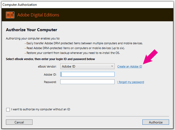 Adobe Digital Editions is require will require you to authorize your computer or mobile device . If you have an Adobe ID , enter those credential . If you do n’t , click the blueCreate an Adobe ID link to create one. Then, click authorize .